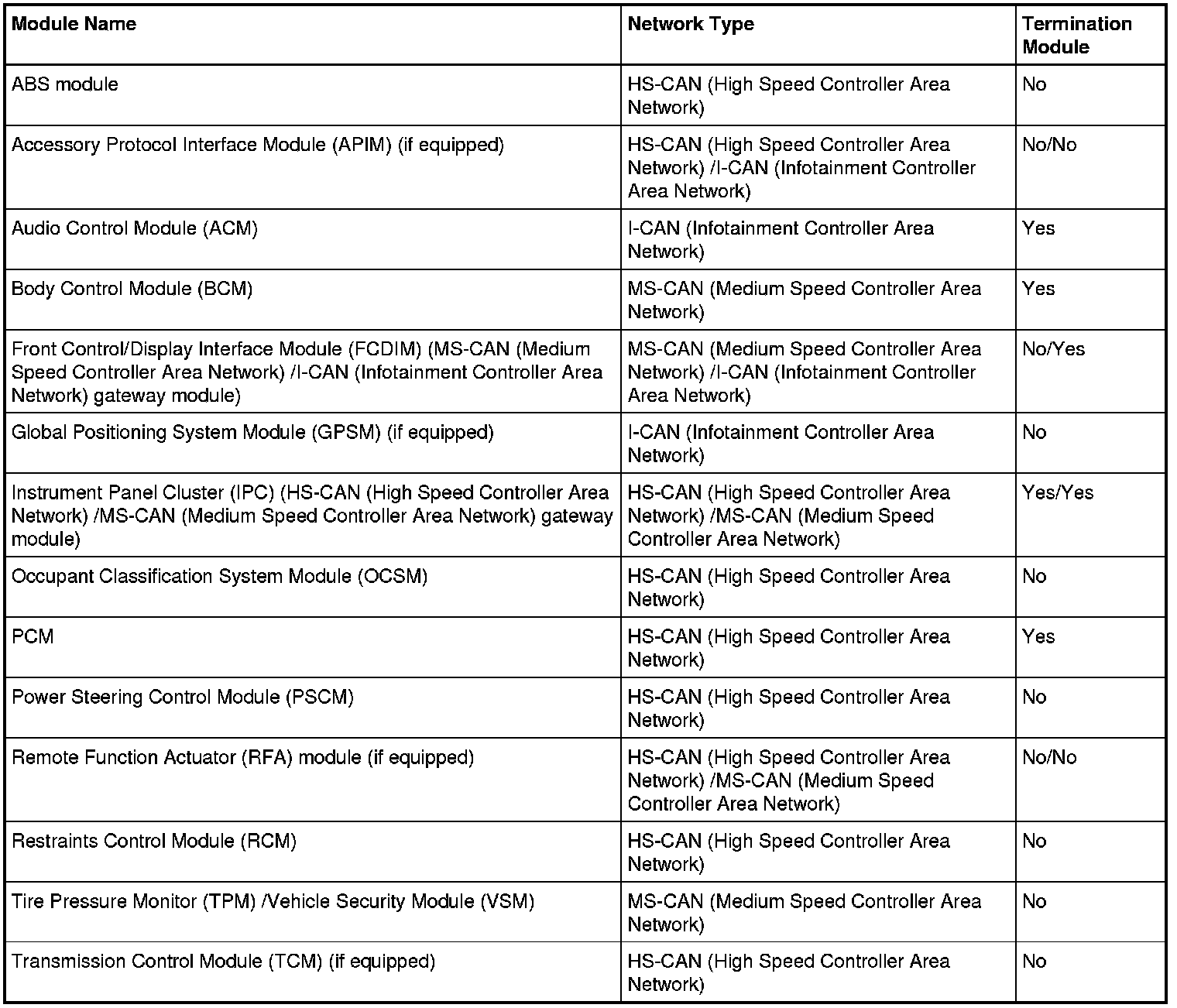 The IPC (Instrument Panel Cluster) is the gateway module, translating HS-CAN (High Speed Controller Area Network) to MS-CAN (Medium Speed Controller Area Network) and vice versa. The FCDIM (Front Control/Display Interface Module) is the gateway module, translating MS-CAN (Medium Speed Controller Area Network) to I-CAN (Infotainment Controller Area Network) and vice versa, allowing a message to be distributed throughout the three networks. The IPC (Instrument Panel Cluster) and the FCDIM (Front Control/Display Interface Module) are the only modules on this vehicle that have this ability.