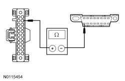 - Measure the resistance between the ACM (Audio Control Module) C240A-14, circuit VDB06 (GY/OG), harness side and the DLC (Data Link Connector) C251-1, circuit VDB06 (GY/OG), harness side.