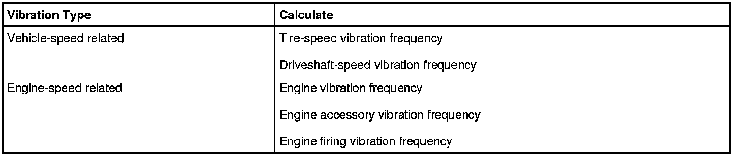 Use the engine rpm where the vibration symptom occurs to determine engine frequency. Calculate engine frequency by dividing the engine rpm by 60 (the number of seconds in a minute). For example, if the corresponding engine rpm of a vibration concern on a vehicle is 2,400 rpm, the resulting engine frequency is 40 Hz. Therefore, a 40 Hz vibration is a first order engine vibration. For purposes of vibration diagnosis, the engine also includes the torque converter and exhaust system.