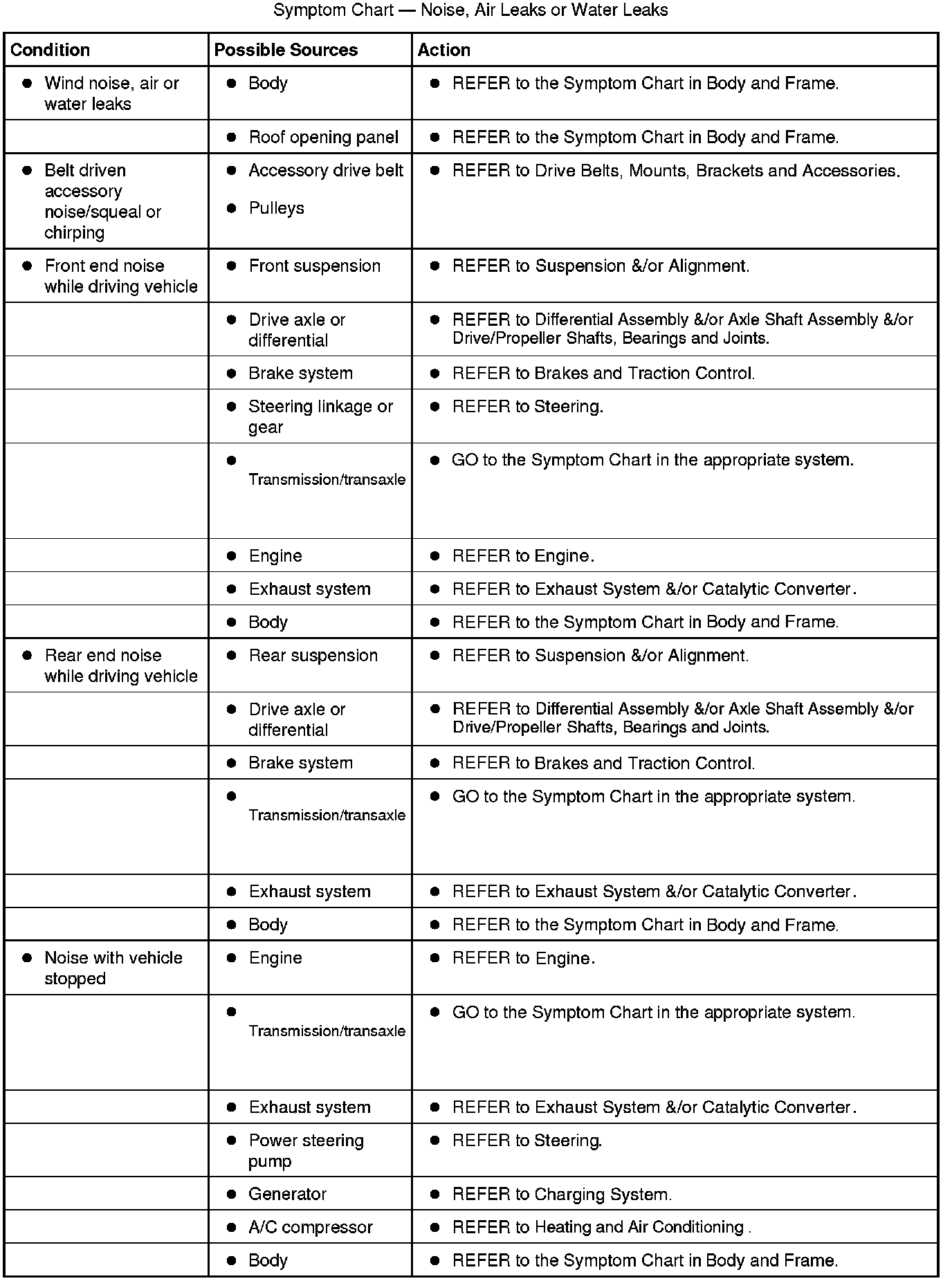 Symptom Chart - Noise, Air Leaks or Water Leaks