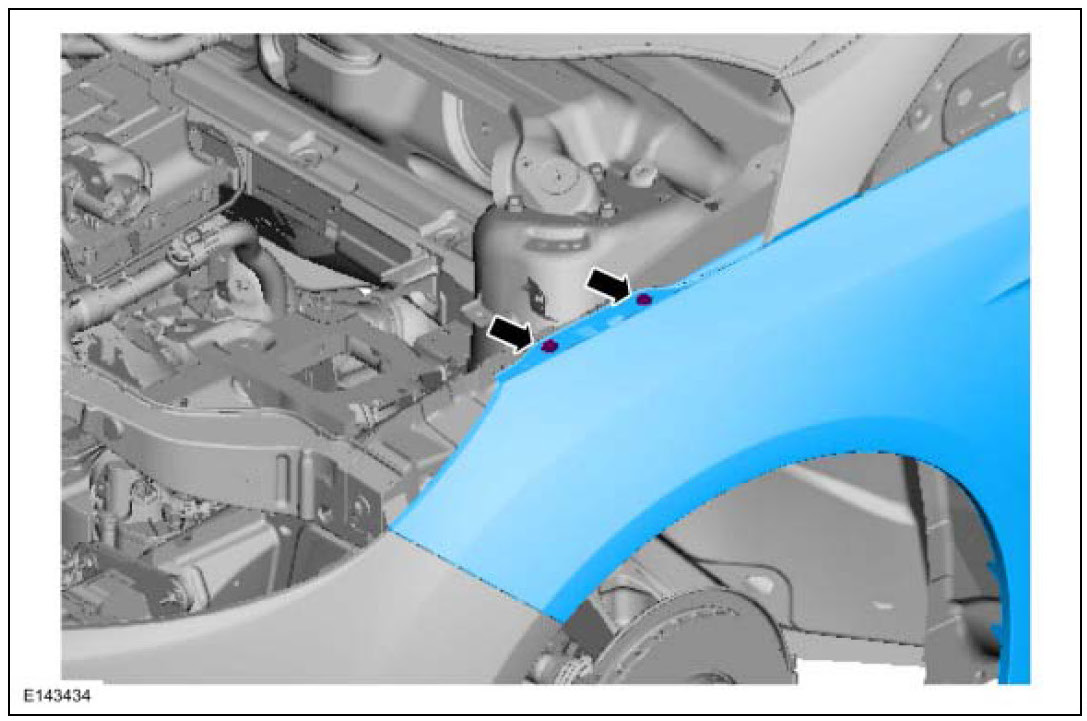 1. Position the fender on the vehicle and loosely install the 2 fender-to-apron bolts.