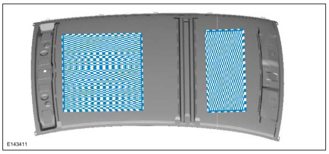 NOTE: Roof panel without sunroof shown. Roof panels with sunroof do not use the forward Noise, Vibration, or Harshness (NVH) pad.