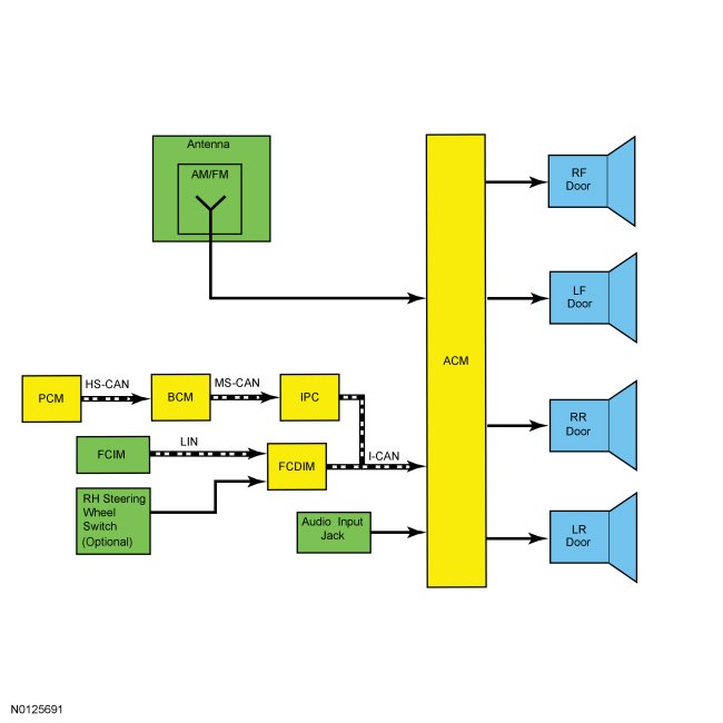 When a portable MP3 (Moving Pictures Experts Group -1 Audio Layer 3) player is connected, audio from the MP3 (Moving Pictures Experts Group -1 Audio Layer 3) player can be played through the vehicle speakers. When a device is connected through the audio input jack, only the speaker volume can be controlled by the vehicle audio system. All other functions (such as seek, fast forward, pause) must be carried out on the device itself. Audio signals are sent from the audio input jack to the ACM (Audio Control Module). There are no external power or ground circuits to the audio input jack.