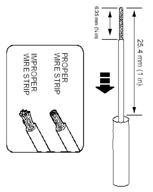 2. Strip 6.35mm (1/4 in) of insulation from each wire end, taking care not to nick or cut wire strands.