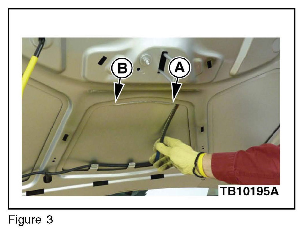 6. Using a hack saw blade or utility knife, place blade in corner of hood reinforcement and carefully cut through mastic bead from points A to B. (Figure 3)