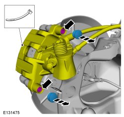 Remove the 2 brake caliper guide pin covers, the 2 brake caliper guide pin bolts and position the brake caliper aside.