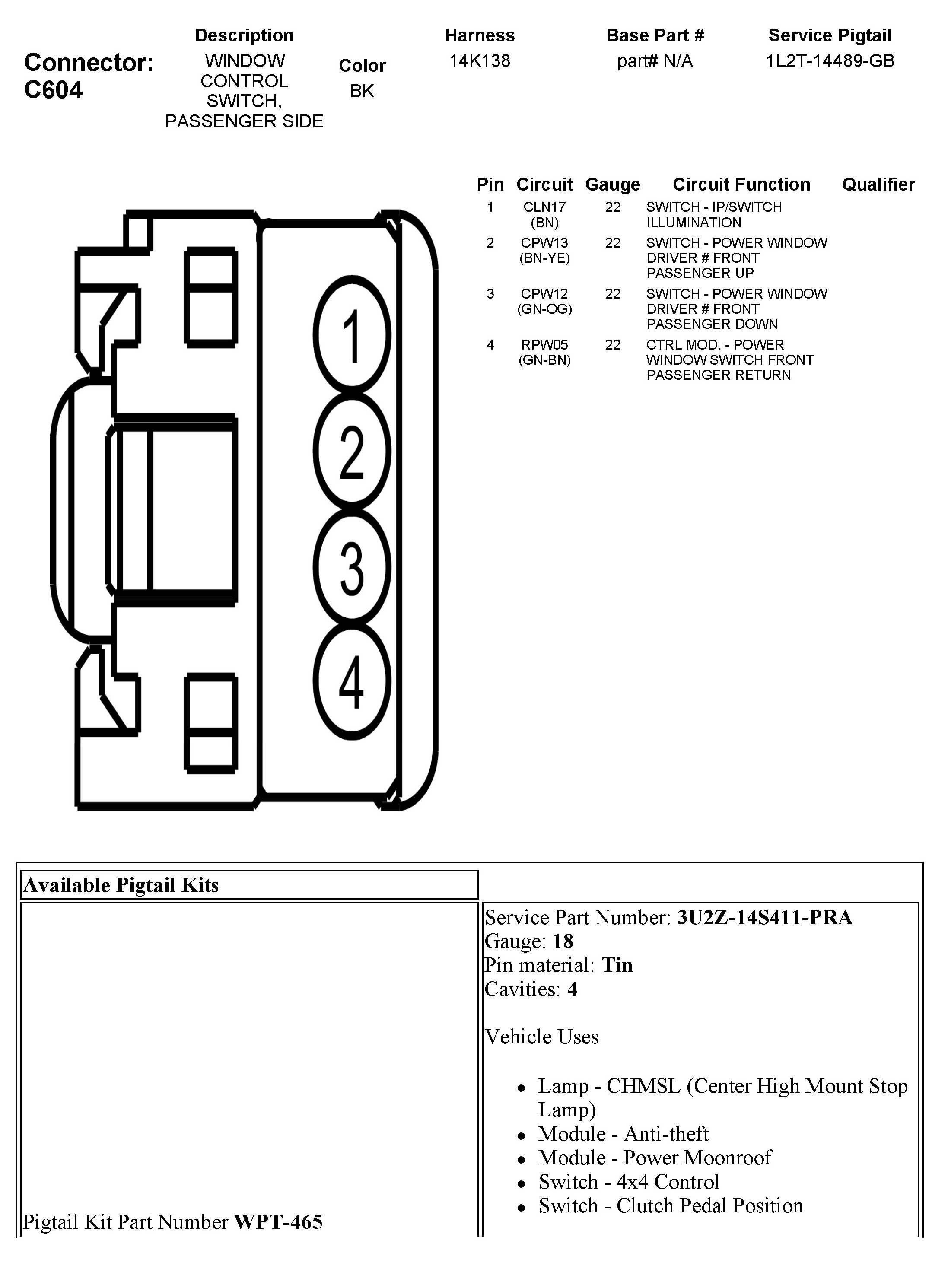 C604 Window Control Switch, Passenger Side