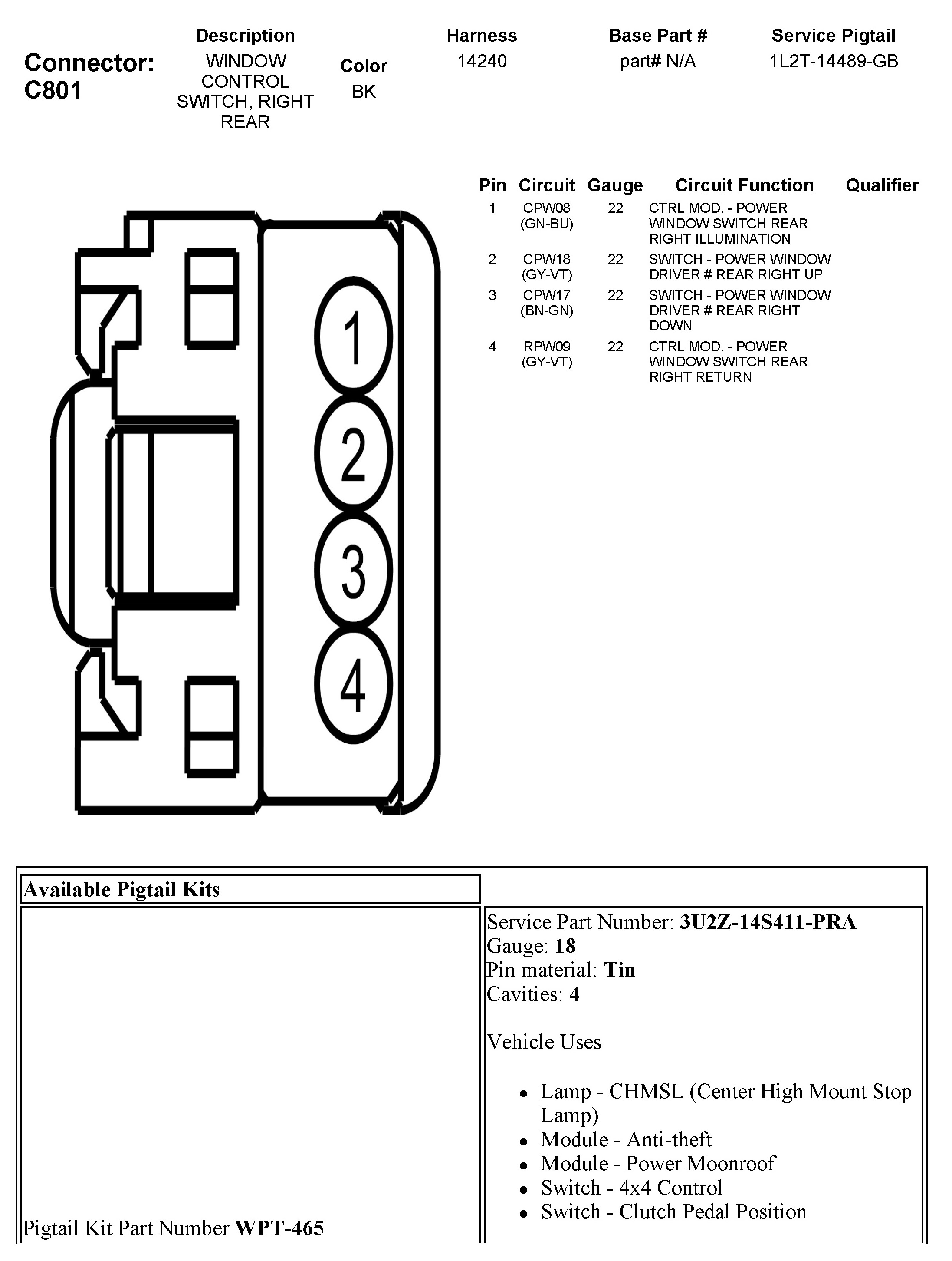C801 Window Control Switch, Right Rear