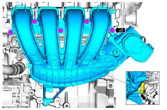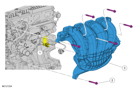 NOTICE: If the engine is repaired or replaced because of upper engine failure, typically including valve or piston damage, check the intake manifold for metal debris. If metal debris is found, install a new intake manifold. Failure to follow these instructions can result in engine damage.