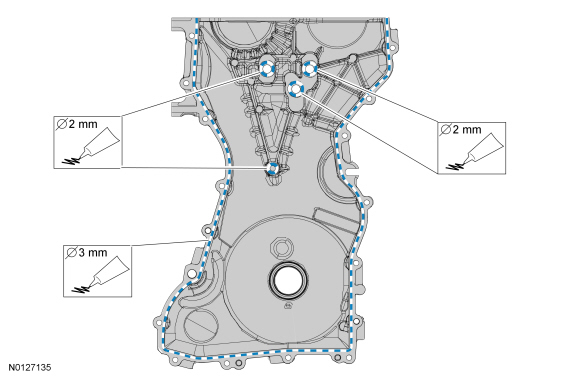 Apply a 3 mm (0.1181 in) bead of Silicone Gasket and Sealant to the sealing surface of the front cover. Apply a 2 mm (0.0787 in) bead of Silicone Gasket and Sealant to the 4 center sealing surface of the front cover.