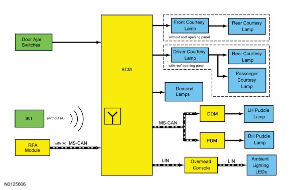 For keyless entry, the BCM (Body Control Module) monitors input from the RKE (Remote Keyless Entry) transmitter (directly from the IKTs (Integrated Keyhead Transmitters) on vehicles without IA (Intelligent Access)) or from the RFA (Remote Function Actuator) module (on vehicles with IA (Intelligent Access)) to determine when to activate/deactivate the illuminate entry and exit functions.