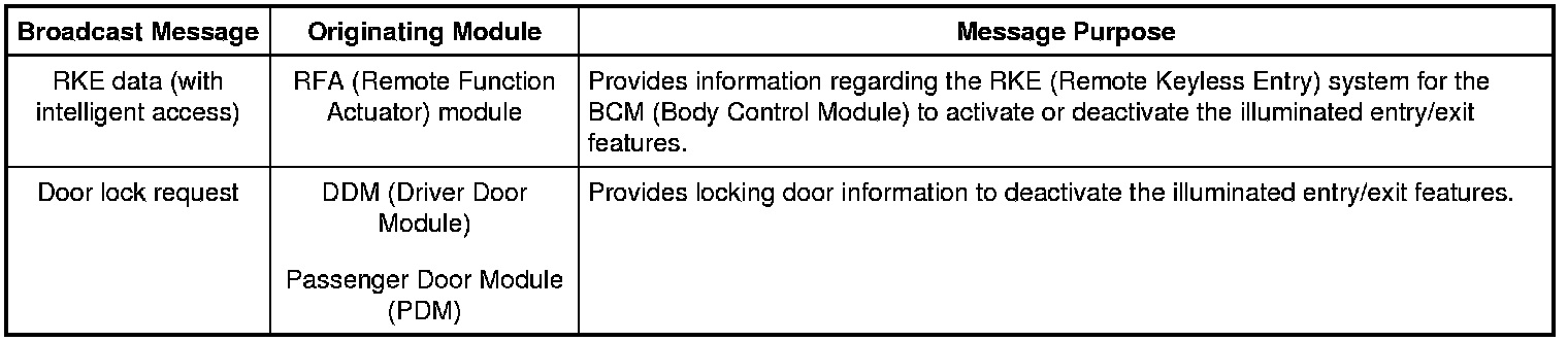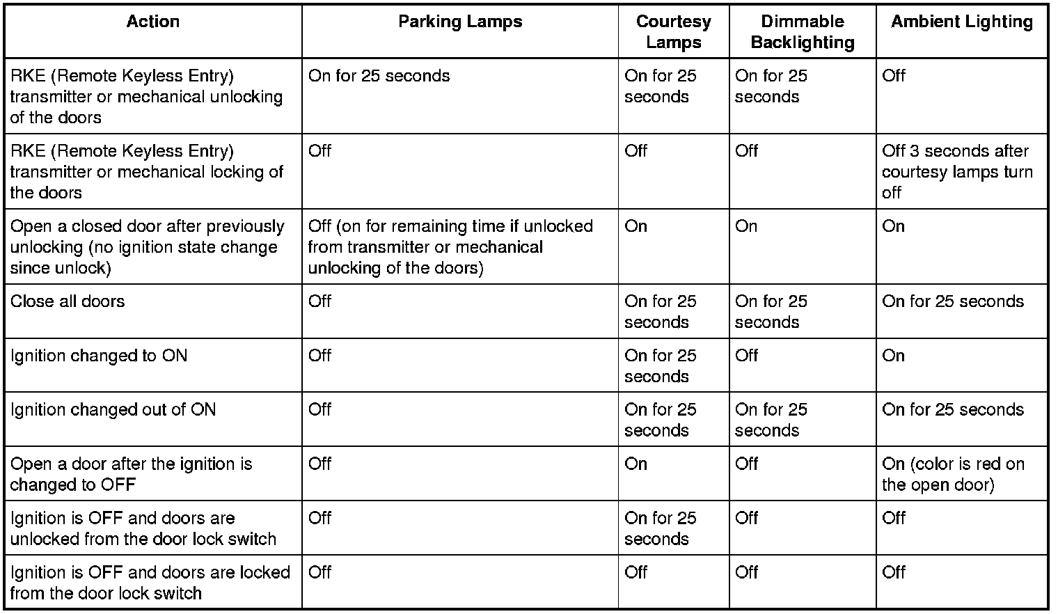 The illuminated entry and exit features provide temporary illumination of the parking lamps, the dimmable backlighting, the ambient backlighting and the courtesy lamps. Refer to the table for additional information.