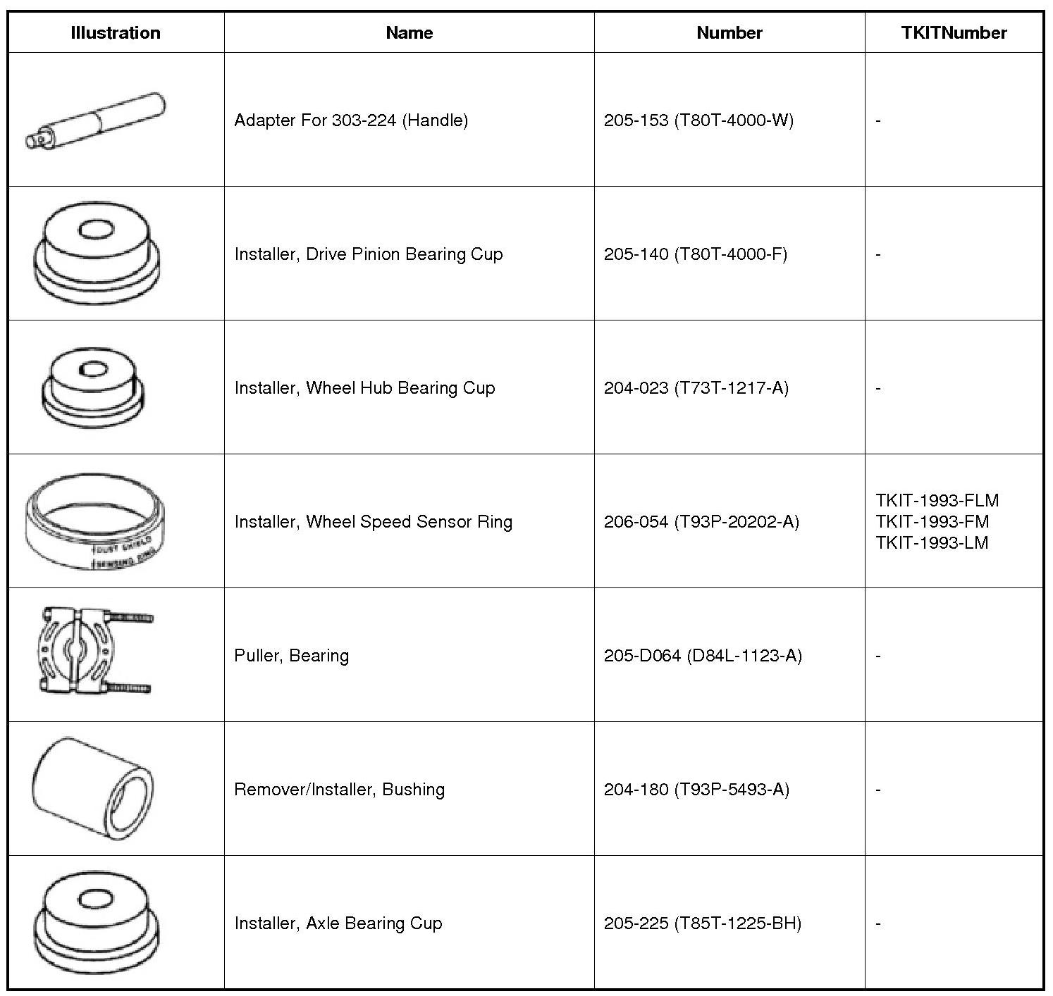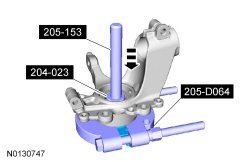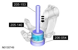 6. Using 205-153 (T80T-4000-W) , 205-140 (T80T-4000-F) , 206-054 (T93P-20202-A) and a hydraulic press, remove the wheel bearing from the wheel knuckle.