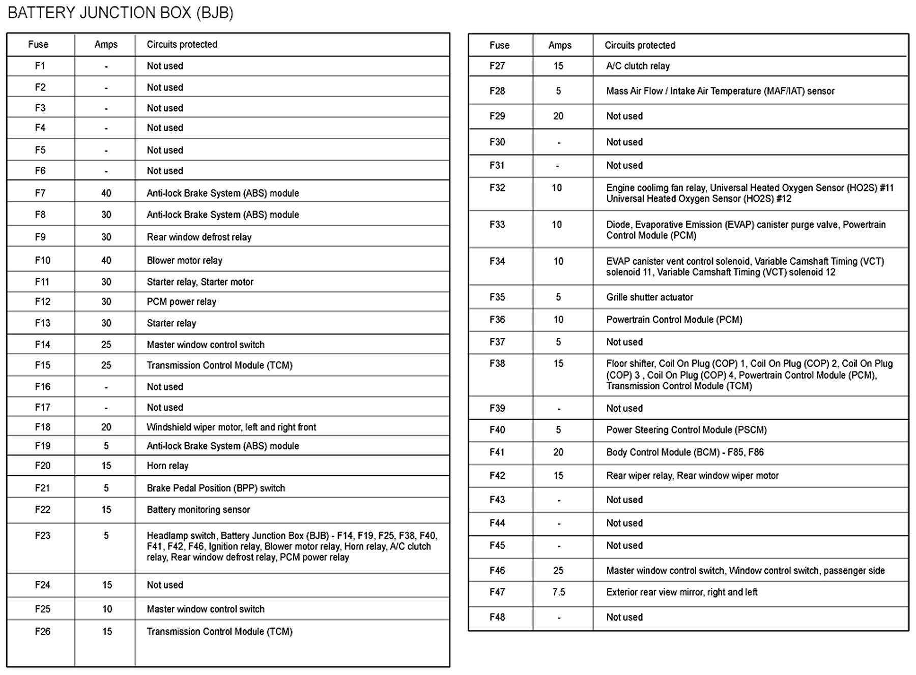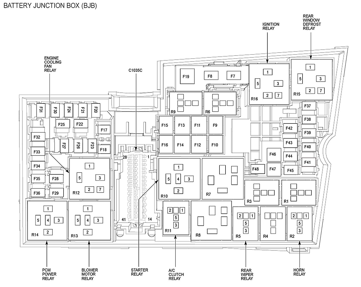 ALLDATA Editor's Note: Ford identifies this one component by 2 different names. Users have reported success comparing these images to determine Application/ID or Location of Fuses and Relays with the Power Distribution Box / Battery Junction Box (BJB).