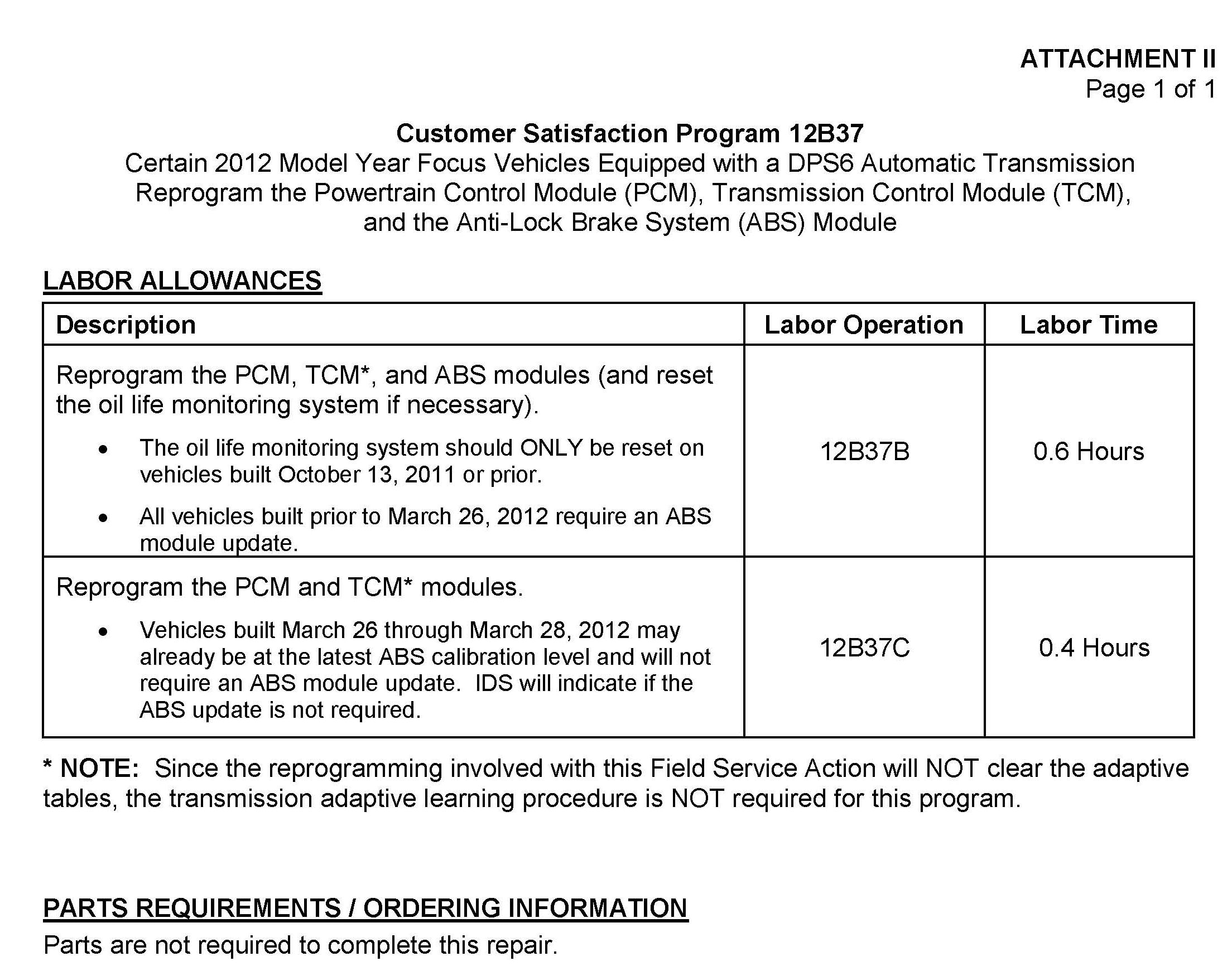 Attachment II - Labor and Parts Information