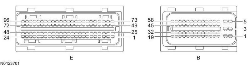 Powertrain Control Module (PCM) Connector - For PCM connector views or reference values, refer to Reference Values.