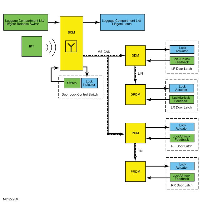 The BCM (Body Control Module) monitors the door lock control switch. When the BCM (Body Control Module) receives a lock/unlock command from the door lock control switch, the BCM (Body Control Module) sends a lock/unlock command message to the DDM (Driver Door Module) and the PDM (Passenger Door Module) over the MS-CAN (Medium Speed Controller Area Network). When the DDM (Driver Door Module) and PDM (Passenger Door Module) receive the lock/unlock command, they send the lock/unlock request to the DRDM (Driver Rear Door Module) and PRDM (Passenger Rear Door Module) over the corresponding LIN (Local Interconnect Network). Each door module then supplies power and ground to the corresponding door lock actuator to unlock or lock the door.