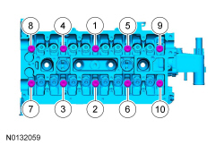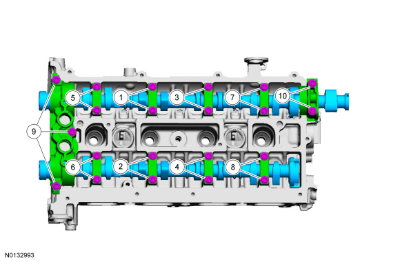 Install the camshaft bearing caps in their original location and orientation and tighten the camshaft bearing cap bolts in pairs in the sequence shown in 2 stages: