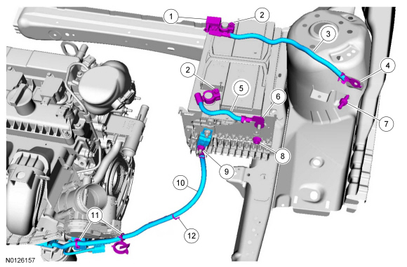 1. Position the battery cable and connect the 2 wire harness retainers to the heater hose and starter motor bracket.