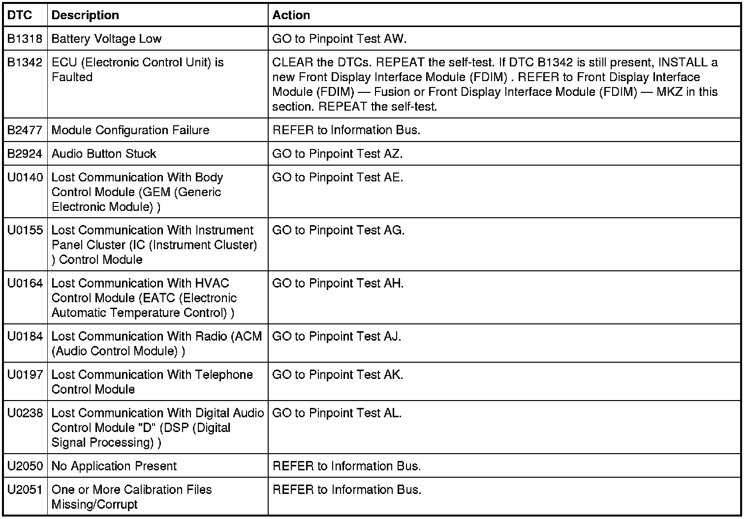Front Display Interface Module (FDIM) DTC Chart - Vehicles Without Navigation