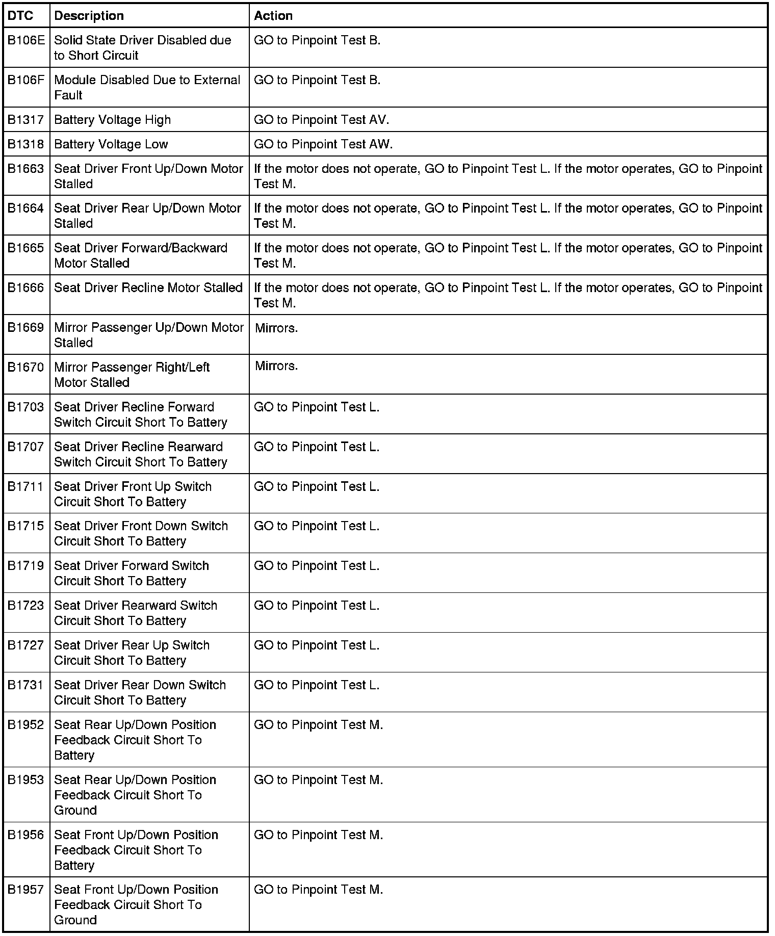 Driver Seat Module (DSM) DTC Chart