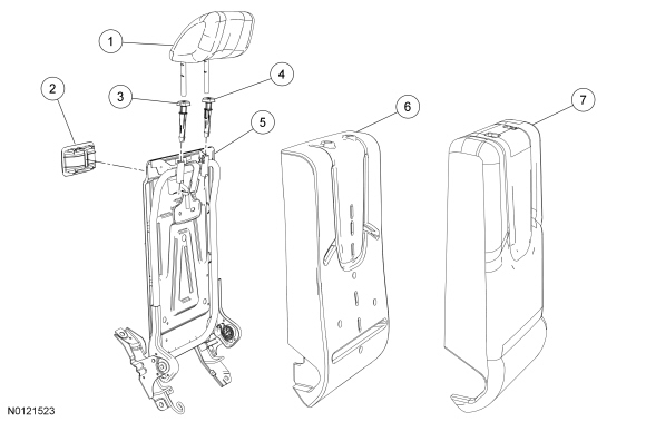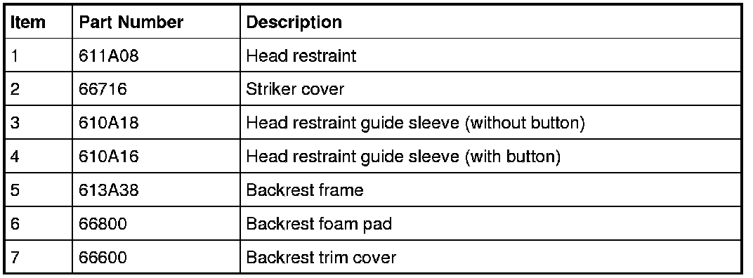 7. NOTE: The head restraint guide sleeves are keyed and will not interchange. To assemble, install the head restraint guide sleeve with the button on the LH side.