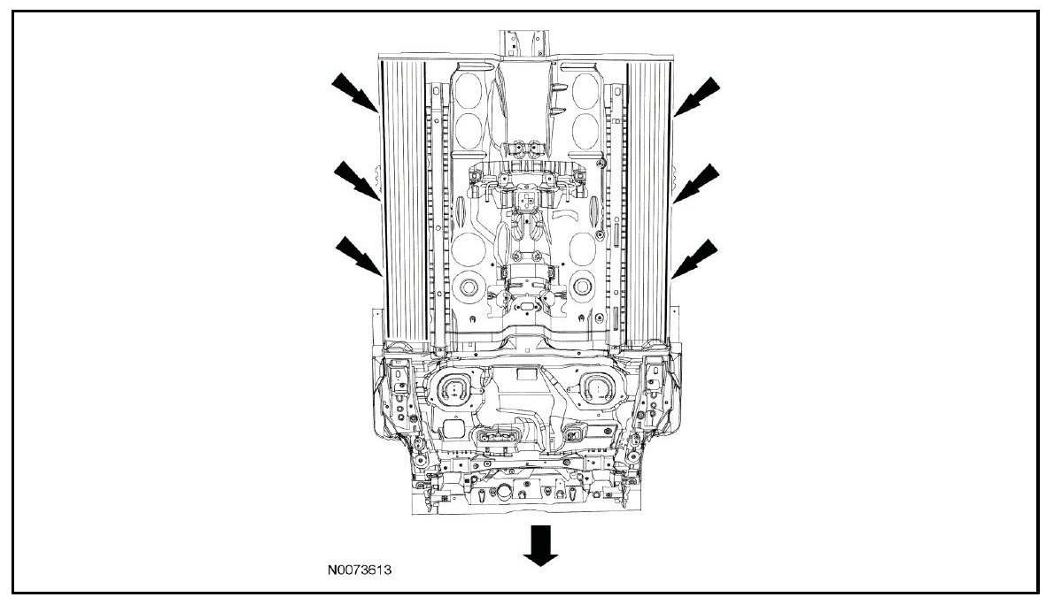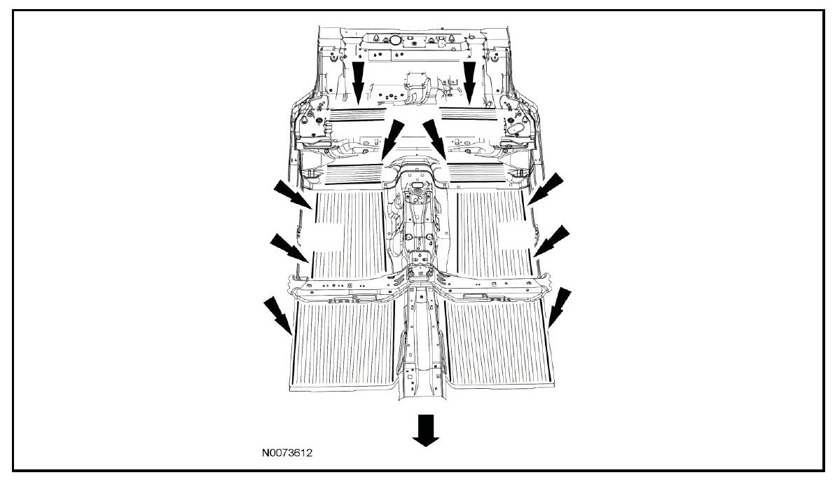 - The following illustrations serve as a reference to indicate mastic sound deadener locations. Sound deadener material is applied from the factory in a pumpable form. Additional insulators and sound deadeners are used beyond those indicated in the illustration.
