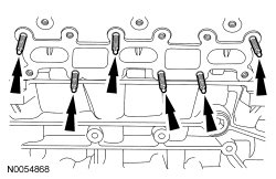 114. NOTICE: Failure to tighten the exhaust manifold nuts to specification a second time will cause the exhaust manifold to develop an exhaust leak.