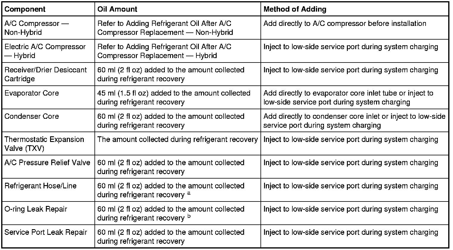 b The amount specified may be used for one or multiple O-ring leak repairs. Do not multiply the refrigerant oil amount by the number of O-ring leaks being repaired.