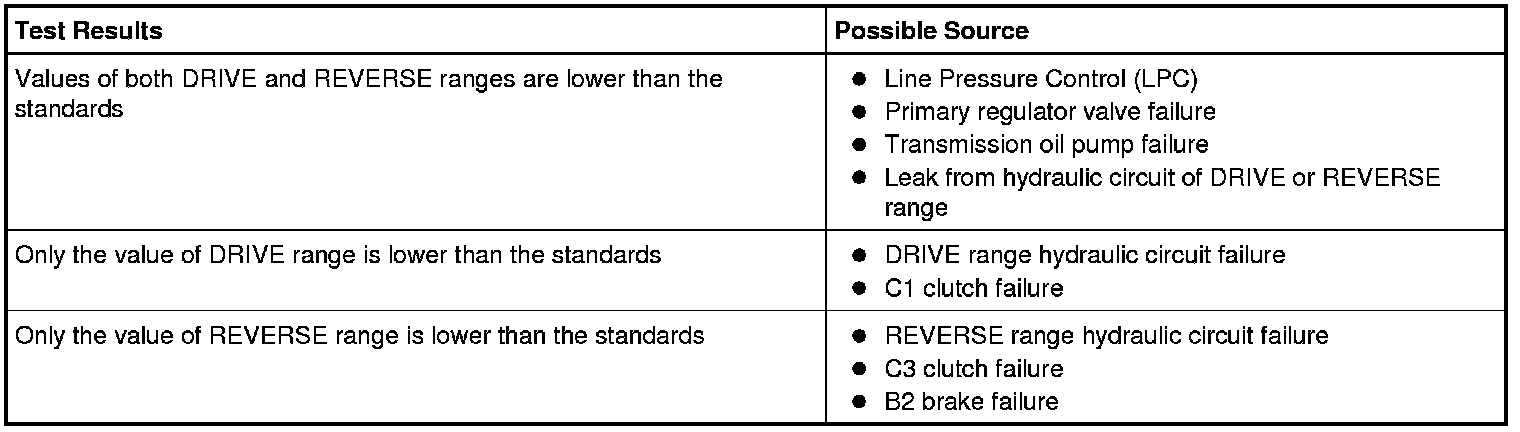 NOTICE: If the pressure is low at stall, do not continue with the test or further transaxle damage will occur. Do not maintain Wide Open Throttle (WOT) in any transaxle range for more than 5 seconds.