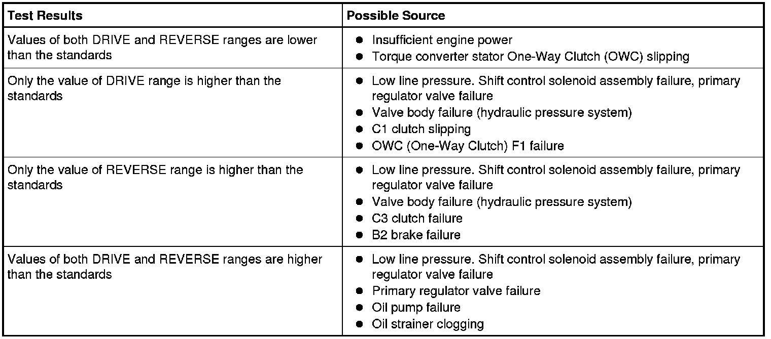 If stall speeds were too high, see the Stall Speed Chart. If stall speeds were too low, first check engine idle speed and tune up. If engine is OK, remove torque converter and check TCC (Torque Converter Clutch) for slippage.