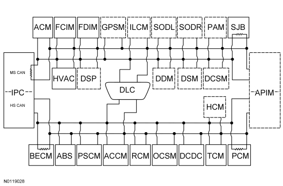 The IPC (Instrument Panel Cluster) is the gateway module, translating messages on the HS-CAN (High Speed Controller Area Network) to MS-CAN (Medium Speed Controller Area Network) and vice versa. This allows a message to be distributed throughout both networks. The IPC (Instrument Panel Cluster) is the only module on this vehicle that has this ability.