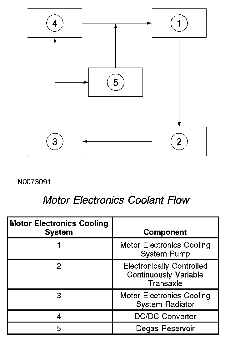 The motor electronics cooling system is required to maintain an acceptable temperature for the transaxle and the DC/DC converter. The system temperature is monitored by the motor electronics coolant temperature (MECT) sensor, which is an input to the PCM. The PCM commands the MECS pump using the MECS pump relay. The MECS pump is commanded on whenever the traction battery conductors are closed. The coolant in the system flows in a loop from the MECS pump, to the transaxle, then into the MECS radiator bottom hose port, out of the top hose port of the MECS radiator, into the DC/DC converter, and back into the MECS pump. The cooling system has a degassing system that is connected in parallel between the MECS radiator and the MECS pump. The degassing system bleeds air/gases into the degas reservoir.