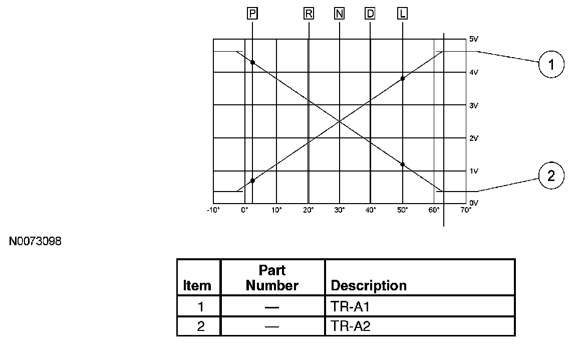 The TR-A1 signal has a positive voltage slope, meaning the voltage increases when the sensor angle increases. The typical TR voltage ranges from approximately 0.7 volt in the PARK position to approximately 3.8 volts in the LOW gear position. The TR-A2 signal has a negative voltage slope. Voltage decreases as the sensor angle increases. The typical voltage for the TR-A2 is approximately 4.3 volts in the PARK position to approximately 1.2 volts in the LOW gear position.