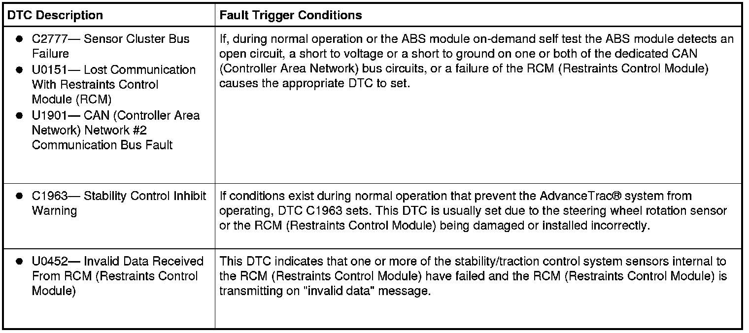 The yaw rate sensor, lateral accelerometer and longitudinal accelerometer are contained in Restraints Control Module (RCM). The RCM (Restraints Control Module) measures vehicle yaw rate, lateral acceleration and longitudinal acceleration and then sends the information to the ABS module along the dedicated Controller Area Network (CAN) bus. This dedicated CAN (Controller Area Network) bus is used only for communication between the RCM (Restraints Control Module) and the ABS module. The information sent to the ABS module is used to help determine if the AdvanceTrac(R) system needs to be activated.