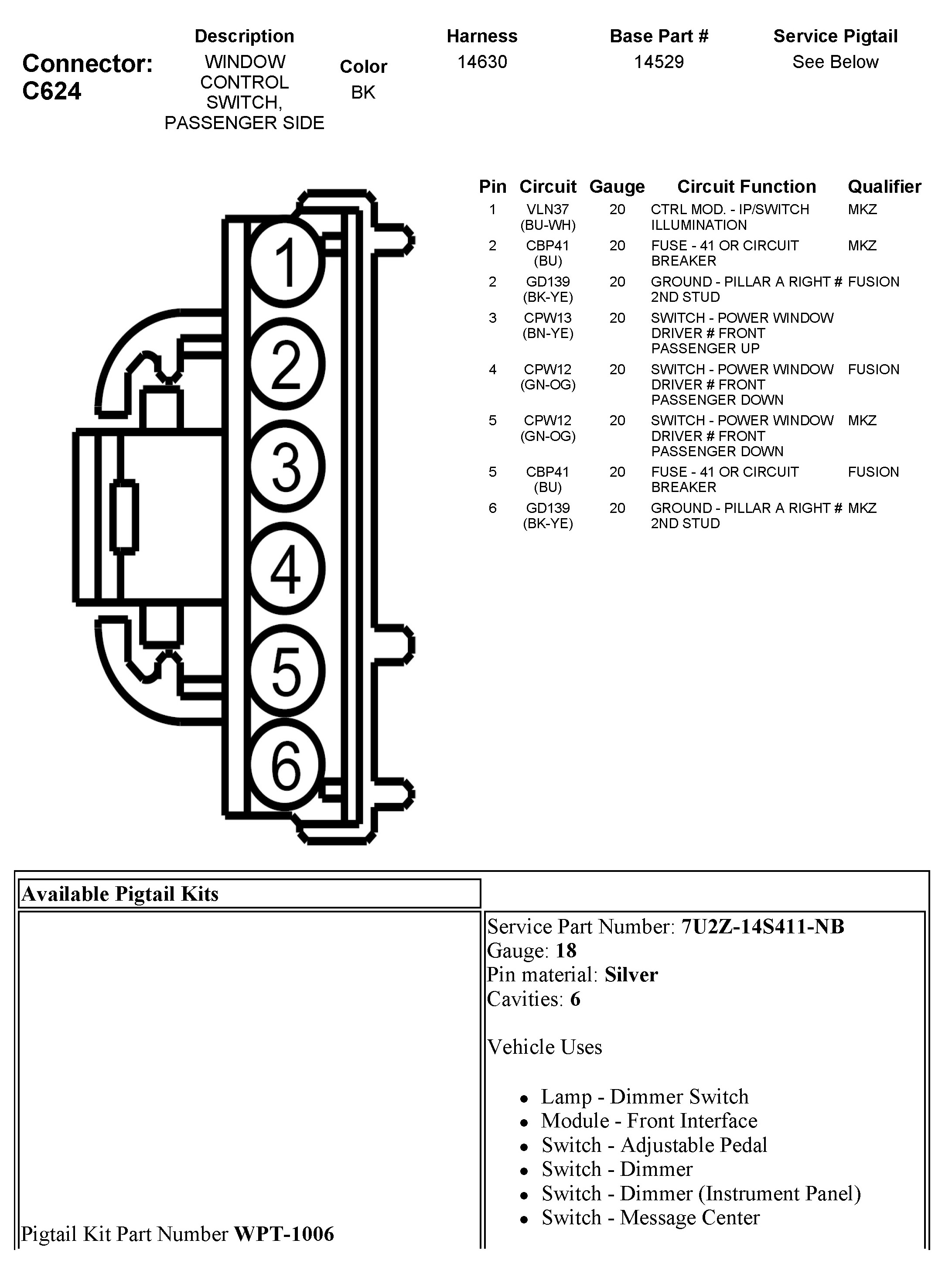 C624 Window Control Switch, Passenger Side