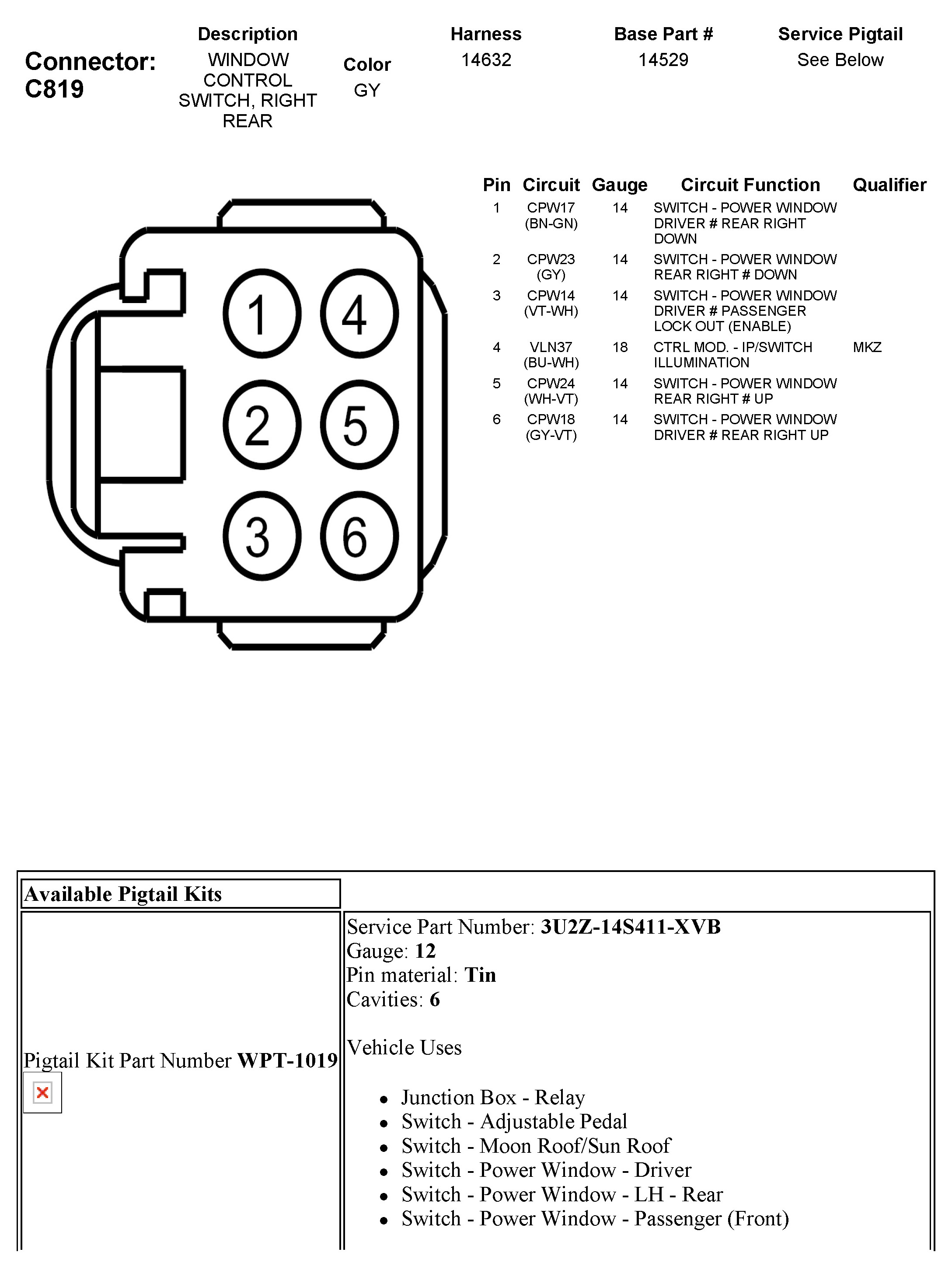 C819 Window Control Switch, Right Rear