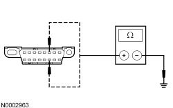 - Measure the resistance between the DLC (Data Link Connector) C251-6, circuit VDB04 (WH/BU), harness side and ground; and between the DLC (Data Link Connector) C251-14, circuit VDB05 (WH), harness side and ground.