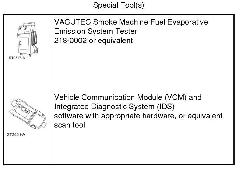 Introduce smoke from the VACUTEC Smoke Machine Fuel Evaporative Emission System Tester into the EVAP (Evaporative Emission) system and verify that smoke is exiting the fuel tank filler pipe neck area. For additional information, refer to the manufacturer's instructions.