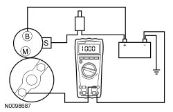 7. Remove the cables from solenoid B-, S- and M-terminals. Clean the cables and connections and reinstall the cables to the correct terminals. Repeat Steps 3 through 6. If the voltage drop reading is still greater than 0.8 volt when checked at the M-terminal and less than 0.8 volt when checked at the B-terminal, the concern is in the solenoid contacts. Install a new starter motor. Refer to Starter Motor- 2.5L , Starter Motor- 3.0L or Starter Motor- 3.5L .