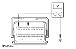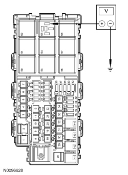 - With the ignition in the START position, measure the voltage between BJB (Battery Junction Box) starter relay socket 86, circuit CE336 (GN/WH), harness side and ground.