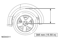 3. NOTICE: Before tightening any suspension bushing fasteners, the suspension must be at the bushing fastener tightening position. Use a suitable jack to raise the suspension until the distance between the center of the hub and the lip of the fender is equal to 395 mm (15.55 in). This will prevent incorrect clamp load and bushing damage.