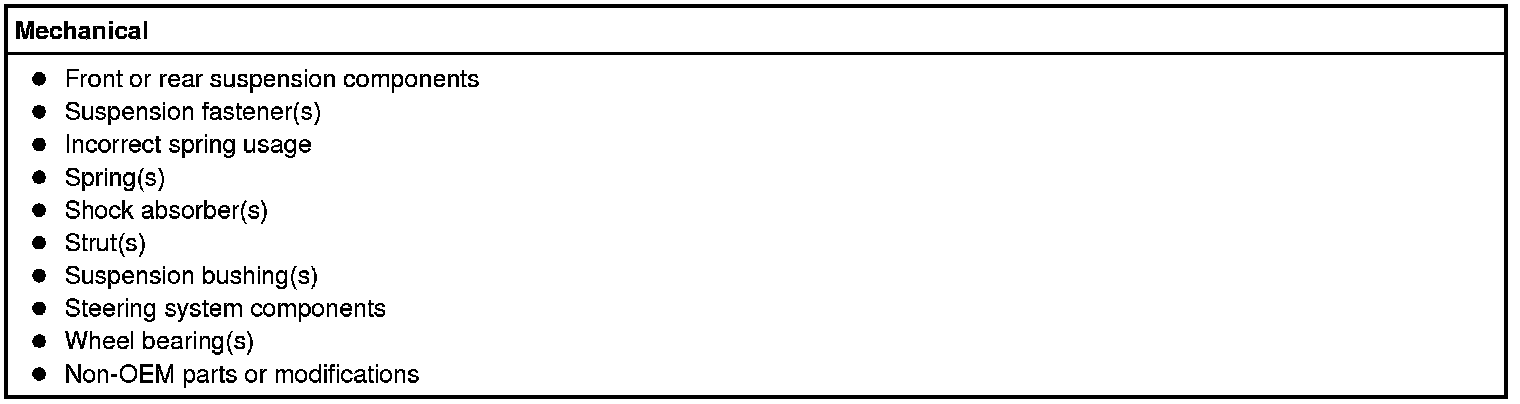 - Check for aftermarket changes to the steering, suspension, and wheel and tire components (such as competition or heavy duty). The specifications shown do not apply to vehicles equipped with aftermarket equipment.