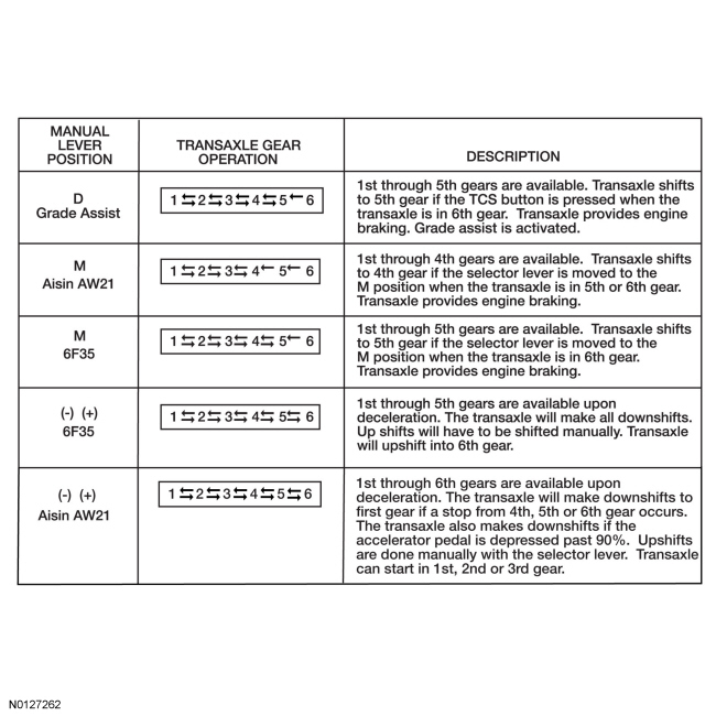 - the 6F35 transaxle operates in gears 1st through 5th and the Aisin AW21 operates in gears 1st through 4th.