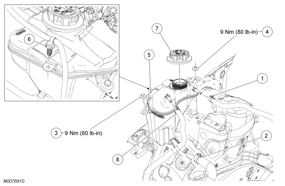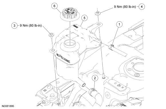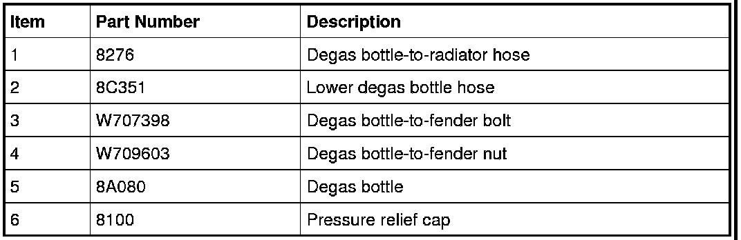 10. Fill the degas bottle. Refer to Cooling System Draining, Filling and Bleeding Service and Repair for the recommended coolant mixture and fill level.