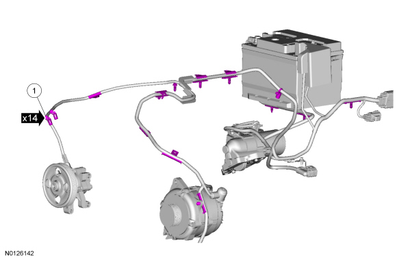 26. Disconnect the battery cable retainer and the generator electrical connector.