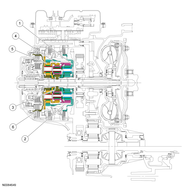 The rear planetary sun gear and shell assembly is splined to both the intermediate (2, 6) clutch and the direct (3, 5, R) clutch. The rear planetary sun gear and shell assembly is held stationary by the intermediate (2, 6) clutch in 2nd and 6th gear and is driven by the direct (3, 5, R) clutch in 3rd and 5th gears and reverse.