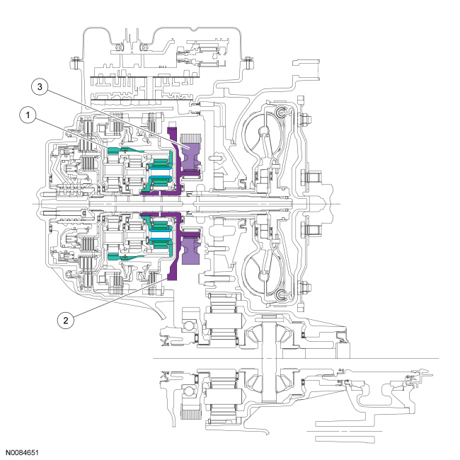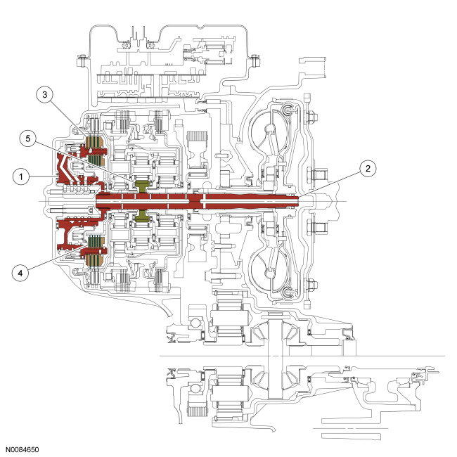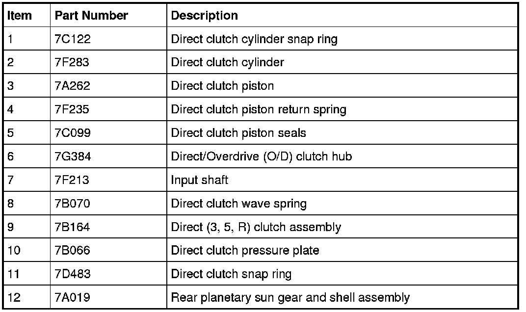 The direct clutch is a drive clutch that transfers power from the direct/O/D (Overdrive) clutch hub assembly to the rear planetary sun gear and shell assembly. The direct clutch is applied in 3rd and 5th gears and reverse.