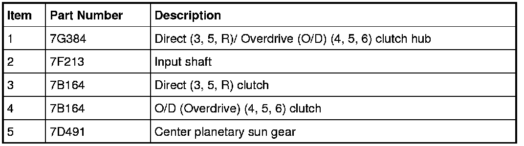 The input shaft is part of the direct/O/D (Overdrive) clutch assembly and is splined to the torque converter turbine and the center planetary sun gear. The input shaft transfers power from the torque converter to the rear planetary gearset through the center planetary sun gear and the direct (3, 5, R) and O/D (Overdrive) (4, 5, 6) clutches.