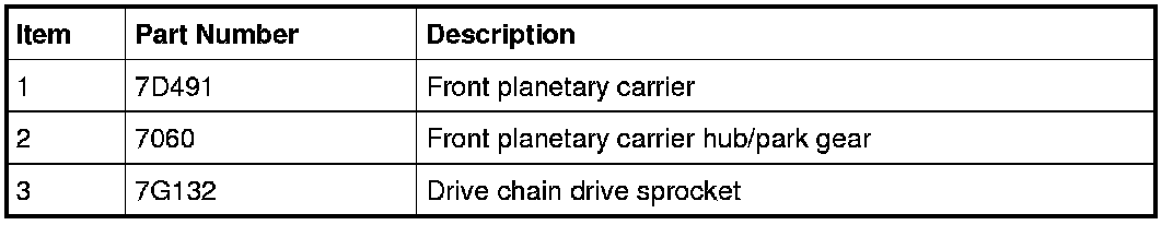 The front planetary carrier is splined to the rear planetary ring gear and transfers power from the rear planetary gearset to the front planetary gearset in 2nd, 3rd, 5th and 6th gears and reverse. The front planetary carrier is splined to the drive chain drive sprocket. The front planetary carrier is the output component for the planetary gearset.
